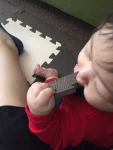 プレイマットの端が簡単に外せるのを覚えたら、歯固めのように噛まれまくりですw